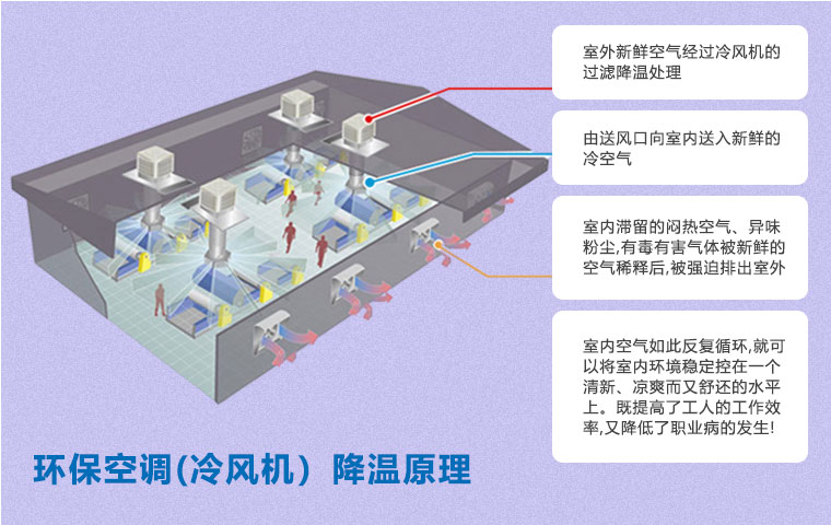 在空氣不流通的環(huán)境中,尤其是化工車間,容易產(chǎn)生建筑綜合癥,如悶熱、頭疼、眩暈、過(guò)敏、咳嗽等不適癥狀。使用環(huán)保空調(diào)(冷風(fēng)機(jī))通風(fēng)降溫方案即可以有效降溫,又能保證空氣流通